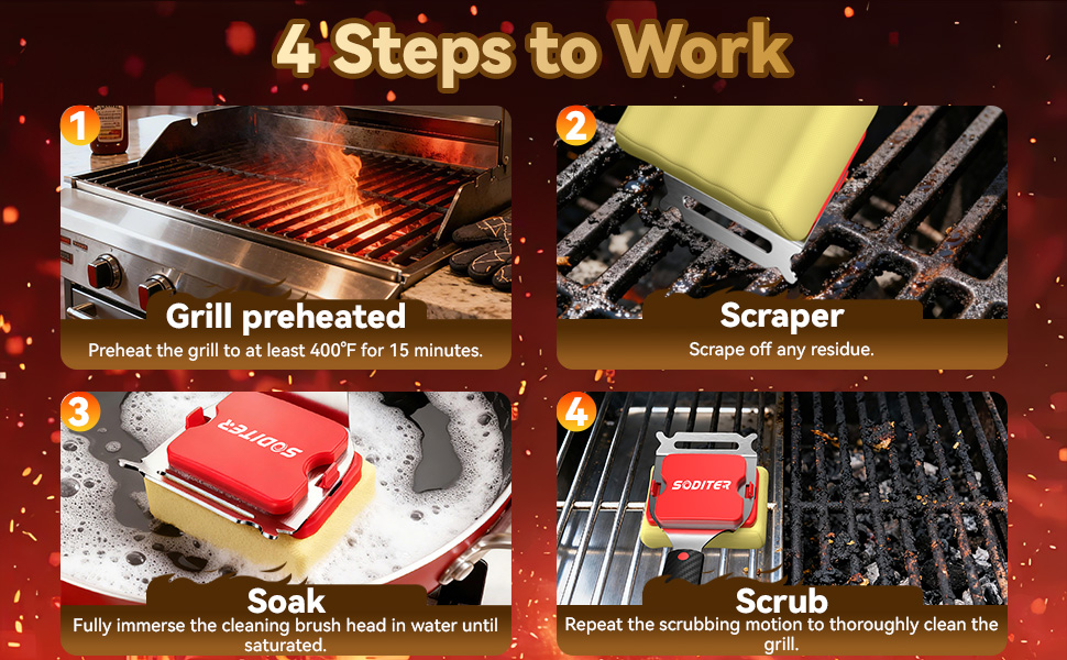 SODITER Grill Brush Bristle Free with Cleaner Scraper,Steam Grill Brush for Outdoor Grill,Replaceable Head Barbecue Grill Safe Cleaner Brush,Seamless-Fit Cast Iron/Stainless-Steel Grates(two brush heads).