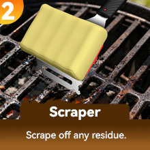 【 Multi-functional Scraper】: 1. The left “V” shaped groove is suitable for rectangular grills. 2. The right circular groove is suitable for round grills. 3. The front groove is suitable for flat grills. 4. The hollowed-out part in the middle can be used as a bottle opener.